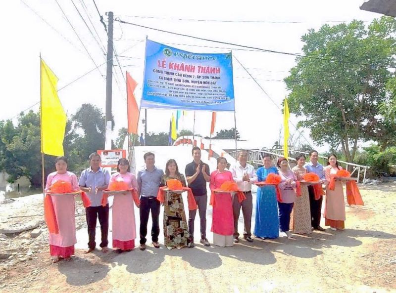 Đại biểu cắt băng khánh thành công cầu Kênh 7 do Tổ chức Associazion ACTI Espérance (Thụy Sỹ) viện trợ